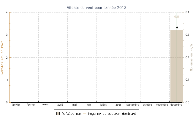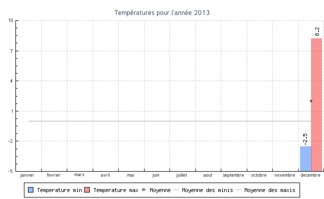 | decembre | -3.0 °C | -1.2 °C | 8.2 °C | 5.0 °C | 1.7 °C | 0.5 km/h | 7.5 km/h | NNO |